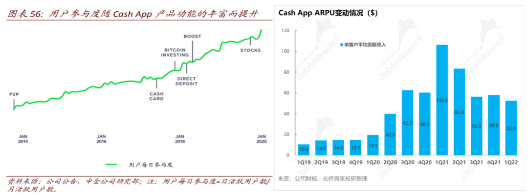 而随着Cash App功能的逐步丰富,用户使用App的频率和粘性也随之提高,公司的营收来源也不断拓展,Cash App用户人均贡献营收从18年的不到$30增长到21年的$280美元。