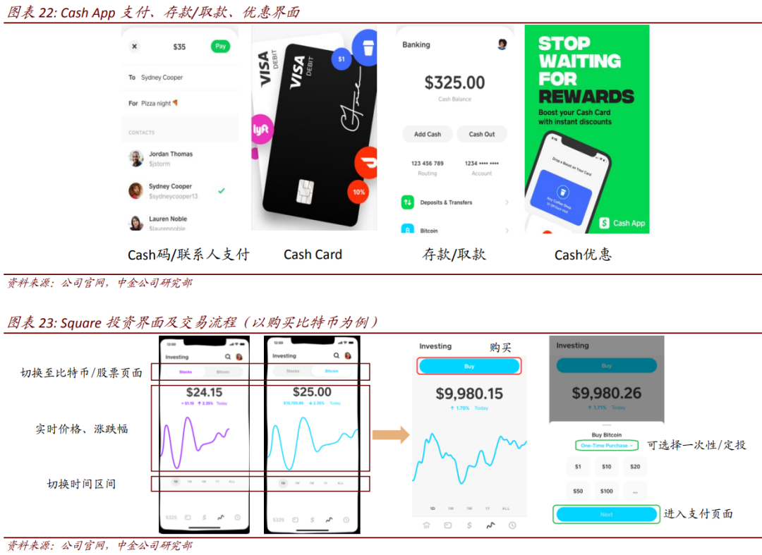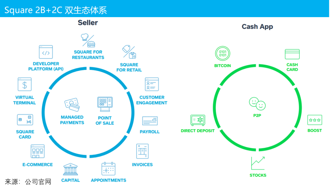 ②是以Cash App一款个人电子钱包为核心的2C业务线,主打P2P转账功能,并衍生出股票/加密货币投资服务,线下付款等服务。