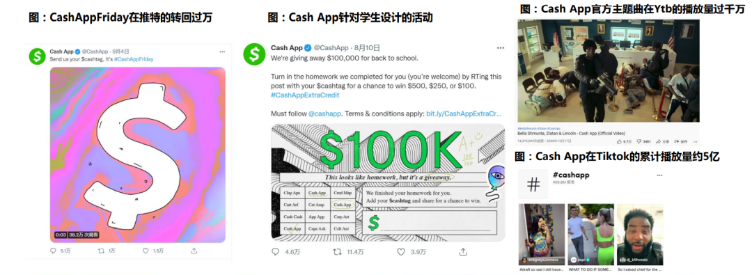 (2)Cash App更好的利用了Facebook,Tiktok,Twitter等社交平台进行宣传,因此在年轻人群体中传播更为广泛。