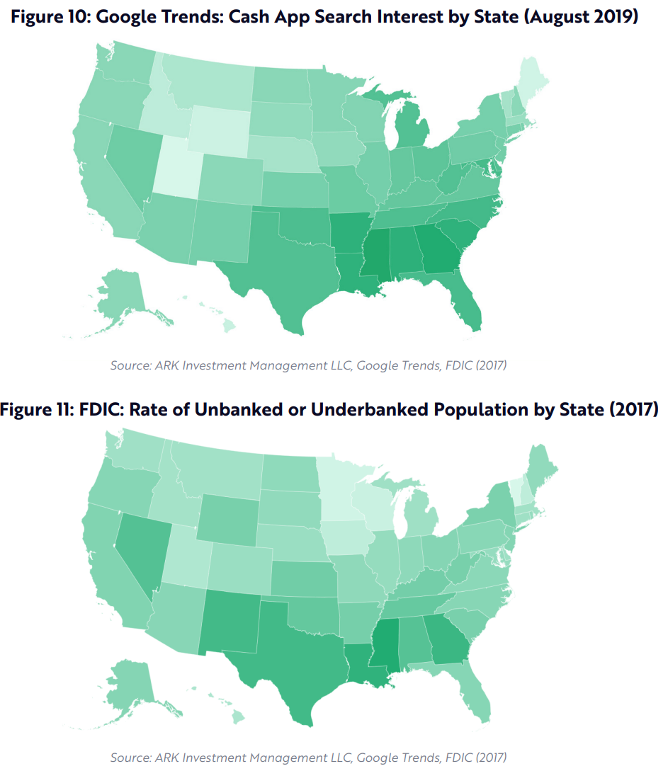 (1)是Cash App的目标用户群体更侧重于没有或缺乏银行服务的年轻人或低收入群体。对于该类用户群体,Cash App能起到主要支付、理财工具的地位,而Venmo和Zelle对其用户群体而言则更多是传统银行服务外的额外支付工具。(下图中Cash App的搜索热度与美国居民缺乏银行服务人口的密度基本对应)