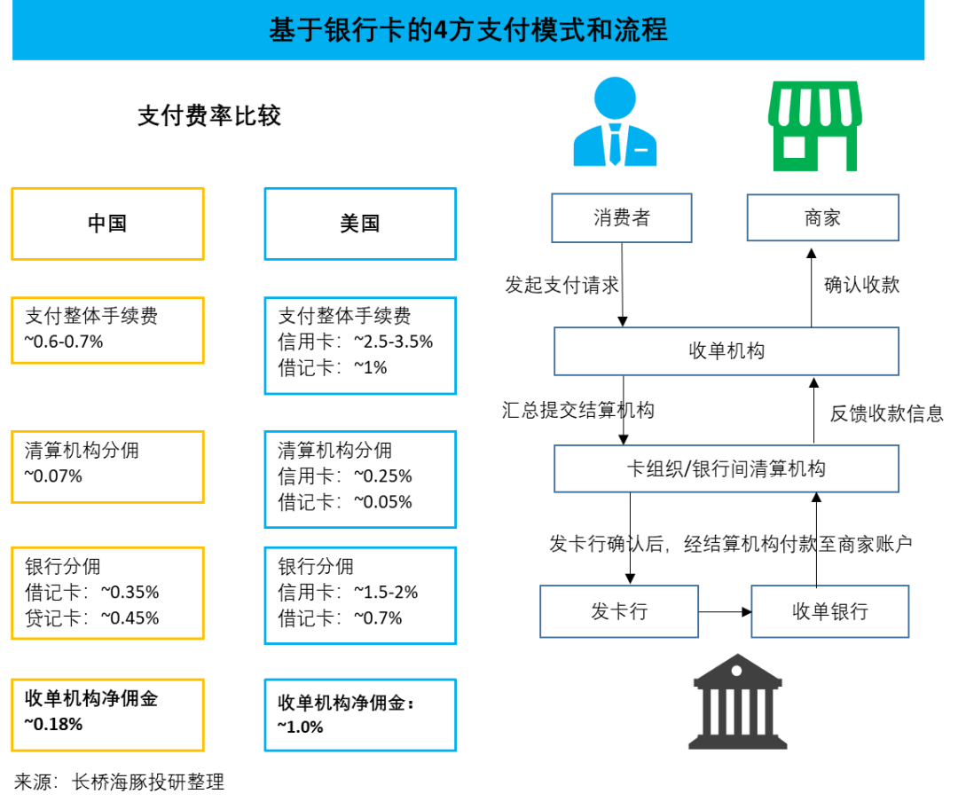 首先,在基于银行卡的四方C2B支付流程中,三方支付机构扮演的角色主要是收单方,即汇集终端消费者的支付请求,并通过卡组织/清算机构,将支付需求传送给银行后台完成支付的角色。一般情况下,支付所产生的费用都由商家承担。举例来说,若美国消费者通过信用卡支付$100,收单方会整体向商家收取~2.5%的商户手续费(Merchant Discount Rate MDR),同时收单机构会分别向清算机构和银行支付~0.25%和~1.5%左右的分佣,收单方收取的净费用率在~1%左右。