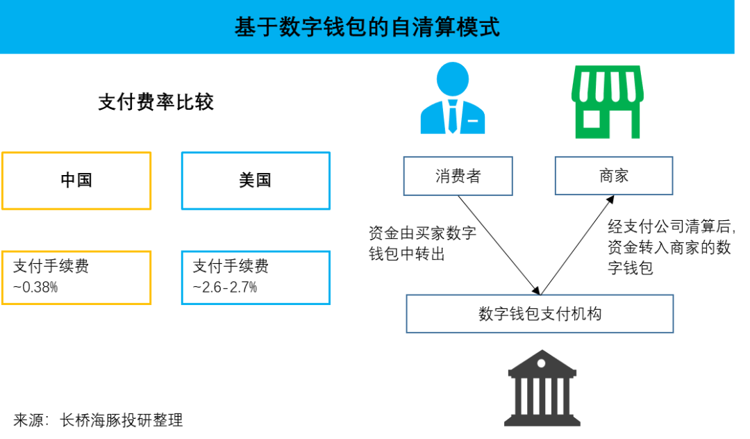 在上述支付流程外,还有三方支付机构获利更丰富的自清算模式。在这种模式下,资金直接由消费者的数字钱包账户经三方支付机构直接转移至商家的数字钱包账户,由于不再涉及消费者和商家的银行账户,以及银行间清算机构,因此数字钱包支付机构能够独占~2.6%-2.7%的支付费用,收益显著高于四方清算模式。不过自清算模式成立的前提是消费者和商家都使用同一品牌下的数字钱包。因此,只有当三方支付机构同时拥有大量C端和B端用户时才可能通过自清算模式攫取更大的收益,目前美国尚无三方支付机构能满足此要求。
