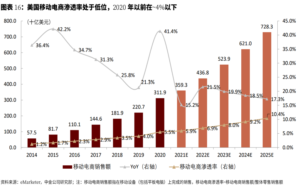 而美国线上销售的占比本就较低,移动电商渗透率更是仅有个位数,多数线上消费通过PC端,因此数字钱包的使用场景并不高。电商市占率40%以上的亚马逊在美国也并不支持PayPal等第三方公司,进一步减少了数字钱包的使用频率。因此,在电子钱包在线上支付都不能占据主导,就更难向线下渗透。