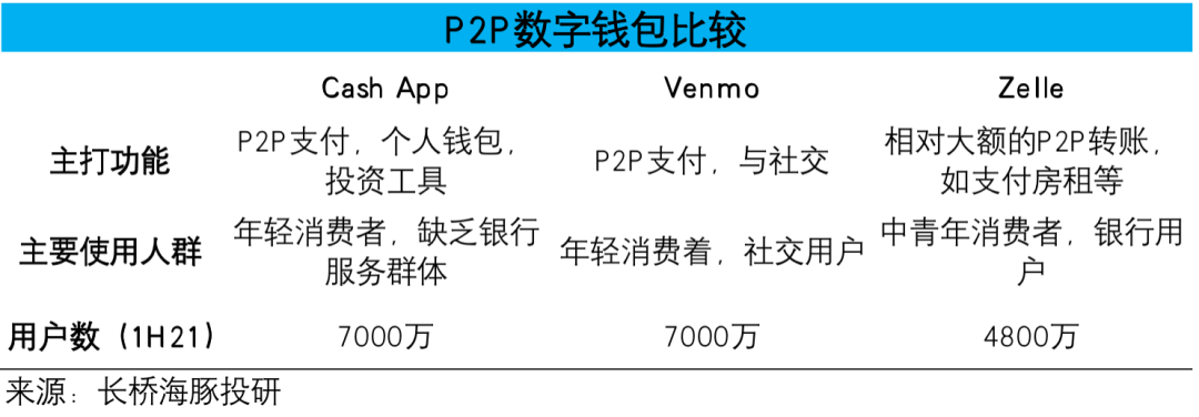 在上述线上/线下C2B支付场景之外,P2P支付场景可谓是美国当前竞争最为激烈,增长潜力也最为可观的支付场景。Cash App,Venmo和银行系的Zelle都在该领域内的有力竞争者,且用户规模都在数千万以上。