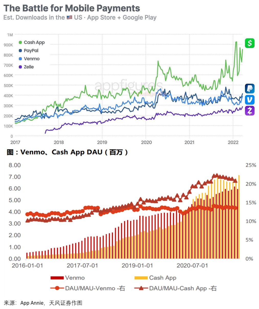 不过从最近的下载量数据和日活用户数来看,诞生较晚的Cash App反而后方先至,目前的增长势头有甩开Venmo的趋势。海豚君认为其背后原因主要有3点: