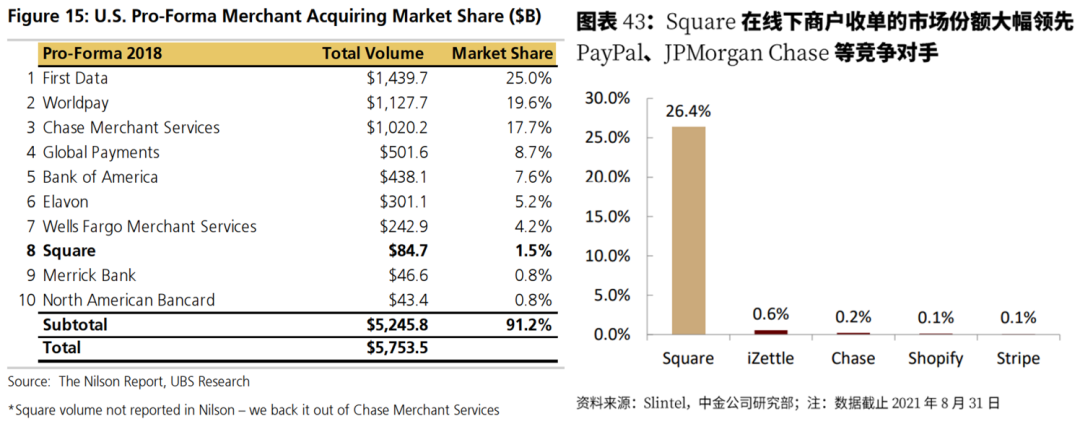 由于Square是少数专注于线下的数字支付公司,因此在该领域有明显的规模优势。据Nilson估计,相较传统线下收单公司,Square的市占率虽然仍相当低, 在2018年占约1.5%的份额,但也已是全美第八大服务商。