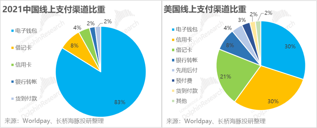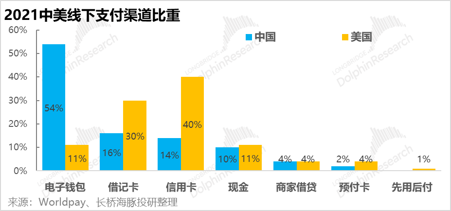 那么在不同情景下,美国数字支付的使用率如何?在利于实体卡支付的线下场景中,美国电子钱包占比仅为11%,相比之下国内电子钱包占比已超过半数。即便在利于数字支付的线上场景,在美国银行卡支付仍是主流,信用卡&借记卡合计占比51%,电子钱包支付占比仅30%。