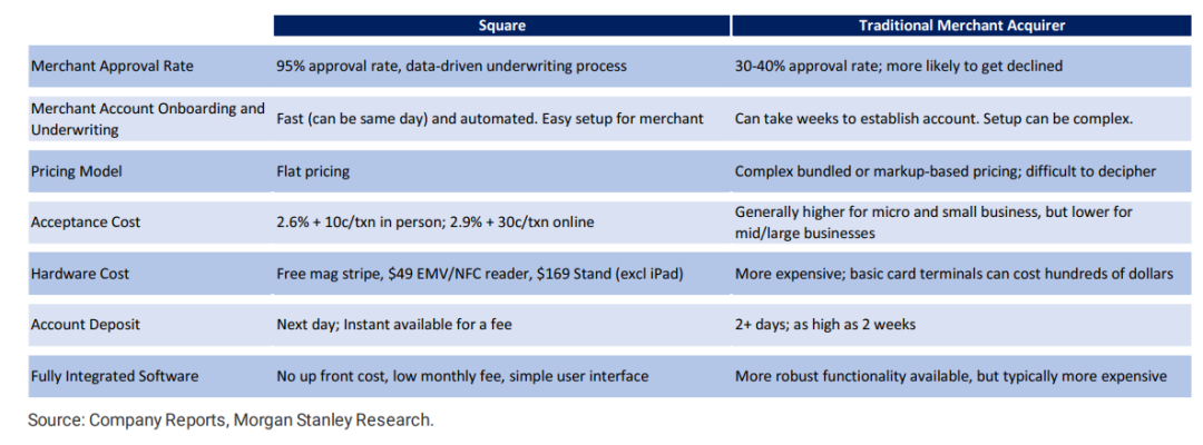 据外行统计,95%的商家都可通过使用Square服务的申请,相比之下传统POS机服务方的通过率仅30-40%。此外Square商家的审批是由系统自动操做,仅需1-2天,而传统服务发则需要数周的审批和调试。