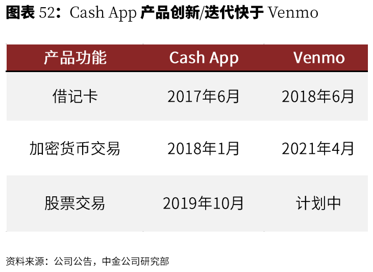 (3)Cash App产品功能迭代速度更快,能更迅速的把握目标群体的需求,并提供更丰富的功能,从而使得用户的依赖程度更高。虽然Venmo也陆续推出了联名借记卡、虚拟货币买卖服务,但节奏始终落后于Cash App。
