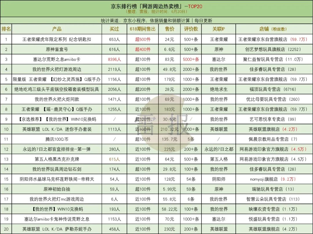 京东相关榜单显示(6月20日数据),按销量和销额进行排名的榜单中,前三分别为“王者荣耀虎年限定系列 纪念钥匙扣”、“原神盲盒号”、“塞达尔荒野之息amiibo卡”,618期间分别售出超500件、超400件、及超100件。总体来看,除了前两款产品,其余产品的销售量基本都在100件左右。