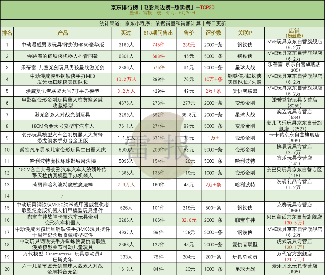 “京东电影周边热卖榜”TOP20(6月20日数据)中,涵盖的基本清一色是钢铁侠、变形金刚、星球大战、哈利波特等海外知名IP,国产IP仅“咖宝车神”上榜,一款汽车玩具618期间售出165件,售价32.8元。除此之外,618期间销量排名最高的前三甲分别为2款钢铁侠系列产品和1款星球大战激光剑,分别售出745件、688件、575件,总体有一半产品的销量在100件左右徘徊。总体来看,漫威系列和变形金刚IP表现非常强势。