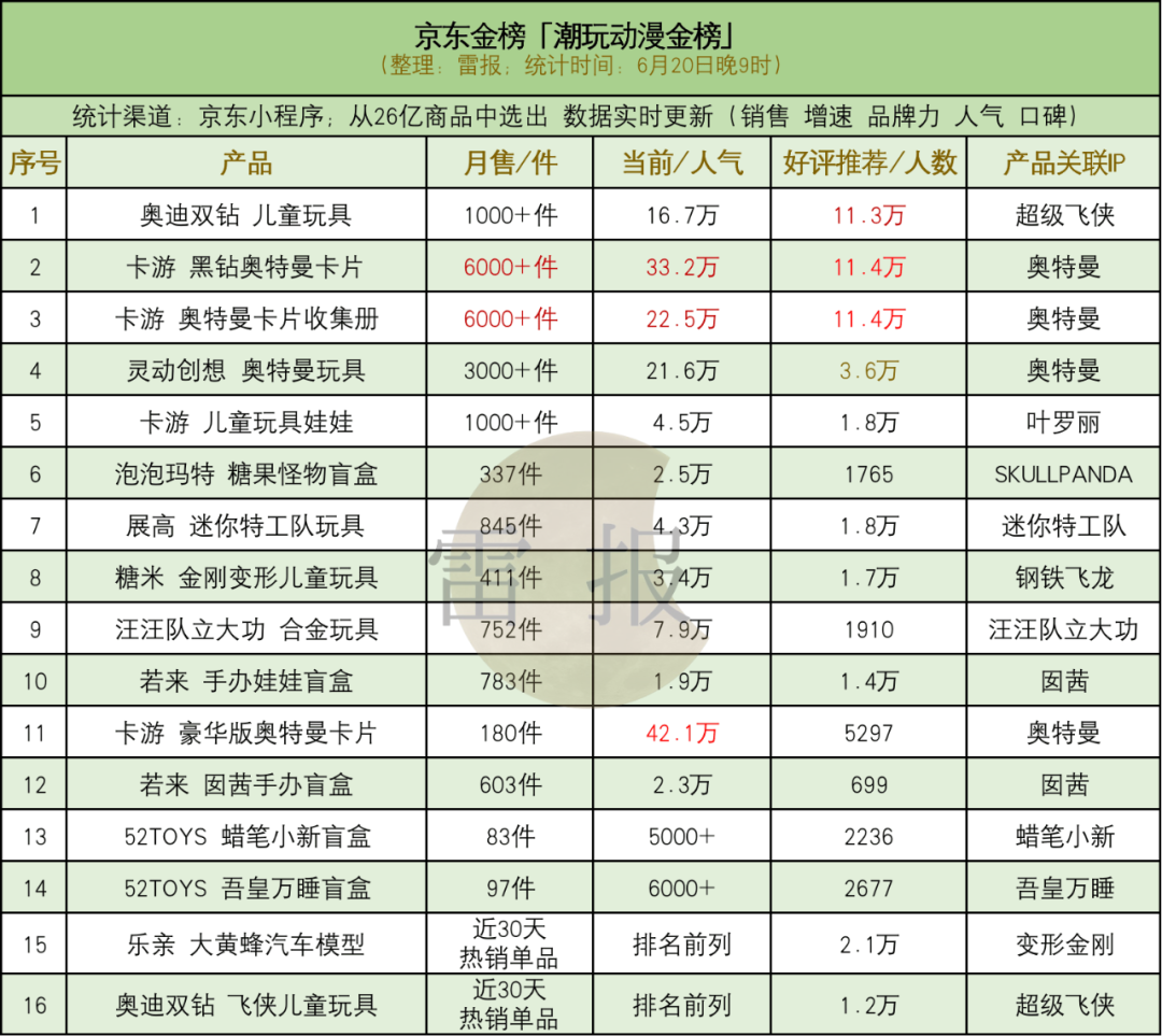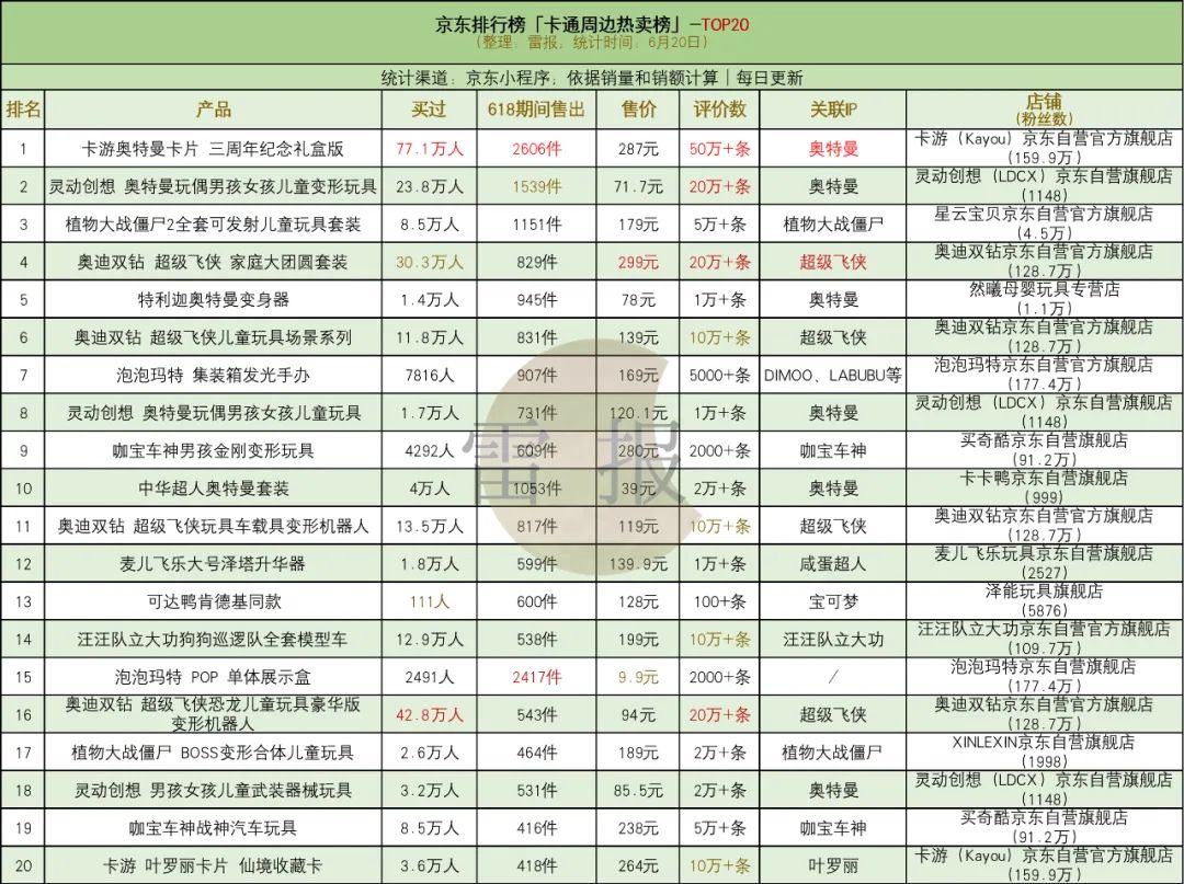 关于卡通IP周边的销售情况,京东“卡通周边热卖榜”TOP20(6月20日数据)显示,“奥特曼”、“超级飞侠”、“植物大战僵尸”、“咖宝车神”等IP周边产品较为热销,尤其“奥特曼”,相关产品总体占比达3成,前10中就占到5席,其中一款产品618期间售出2600多件,位列第一,评价数也达到50万+条,这些产品多来自卡游、灵动创想等官方店铺;“超级飞侠”有4款产品上榜,均来自奥迪双钻京东自营官方旗舰店,还有“汪汪队立大功”、“叶罗丽”、泡泡玛特旗下IP等进入榜单。