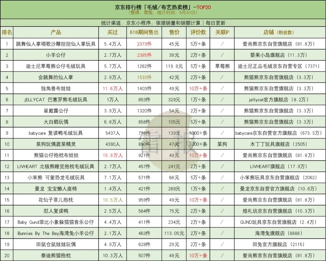京东的“毛绒/布艺热卖榜”显示(6月20日数据),TOP20中销量最高的三款产品分别为“小羊公仔”和2款来自不同店铺的“会跳舞的仙人掌”,618期间分别售出2385件、2373件、及1533件,总体来看的话,大部分产品的销售数量在1000件以下,但最低也达到400多件,售价方面,几十元到几百元不等。