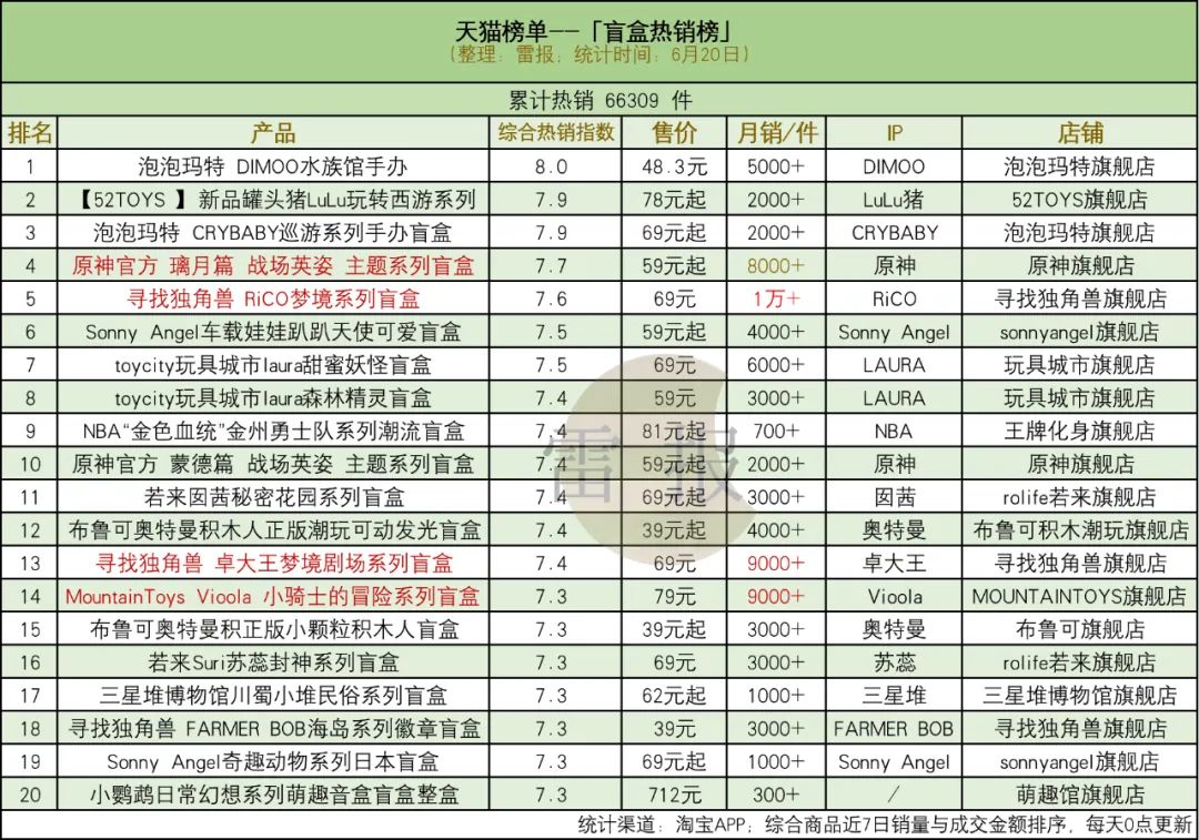 据雷报6月20日统计,平台累计热销手办约2.36万件,相比盲盒的6.6万件,有不小的差距。
