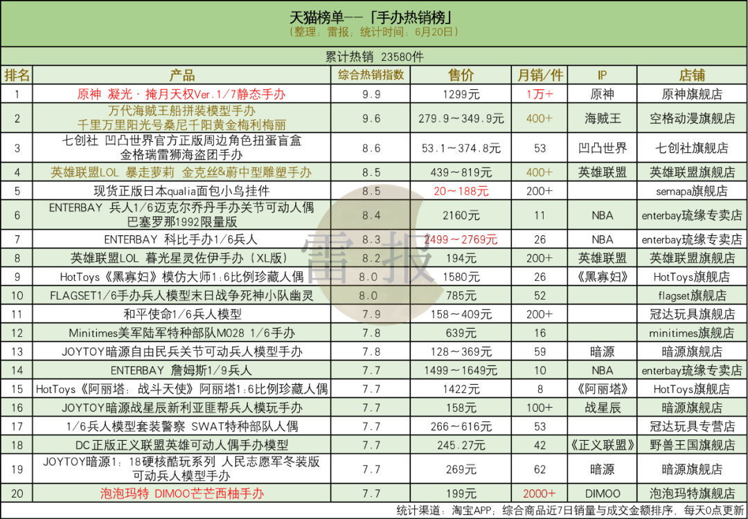 店铺方面,enterbay琉缘专卖店、HotToys旗舰店、英雄联盟旗舰店、暗源旗舰店、冠达玩具店等店铺内有多款产品上榜;IP方面,榜单涵盖游戏IP“原神”、“英雄联盟”,动漫IP“凹凸世界”、“海贼王”、“暗源”等,影视IP《黑寡妇》、《阿丽塔:战斗天使》、《正义联盟》等,除此之外还有“NBA”和泡泡玛特的“DIMOO”系列产品进入榜单。