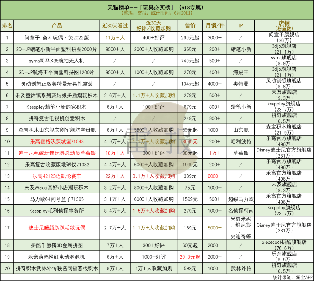 天猫618专属的“玩具必买榜”显示(6月20日数据),位列前3的分别为“问童子 奋斗玩偶·兔2022版”、“3D-JP蜡笔小新平面塑料拼图”、及“syma司马X35航拍无人机”。