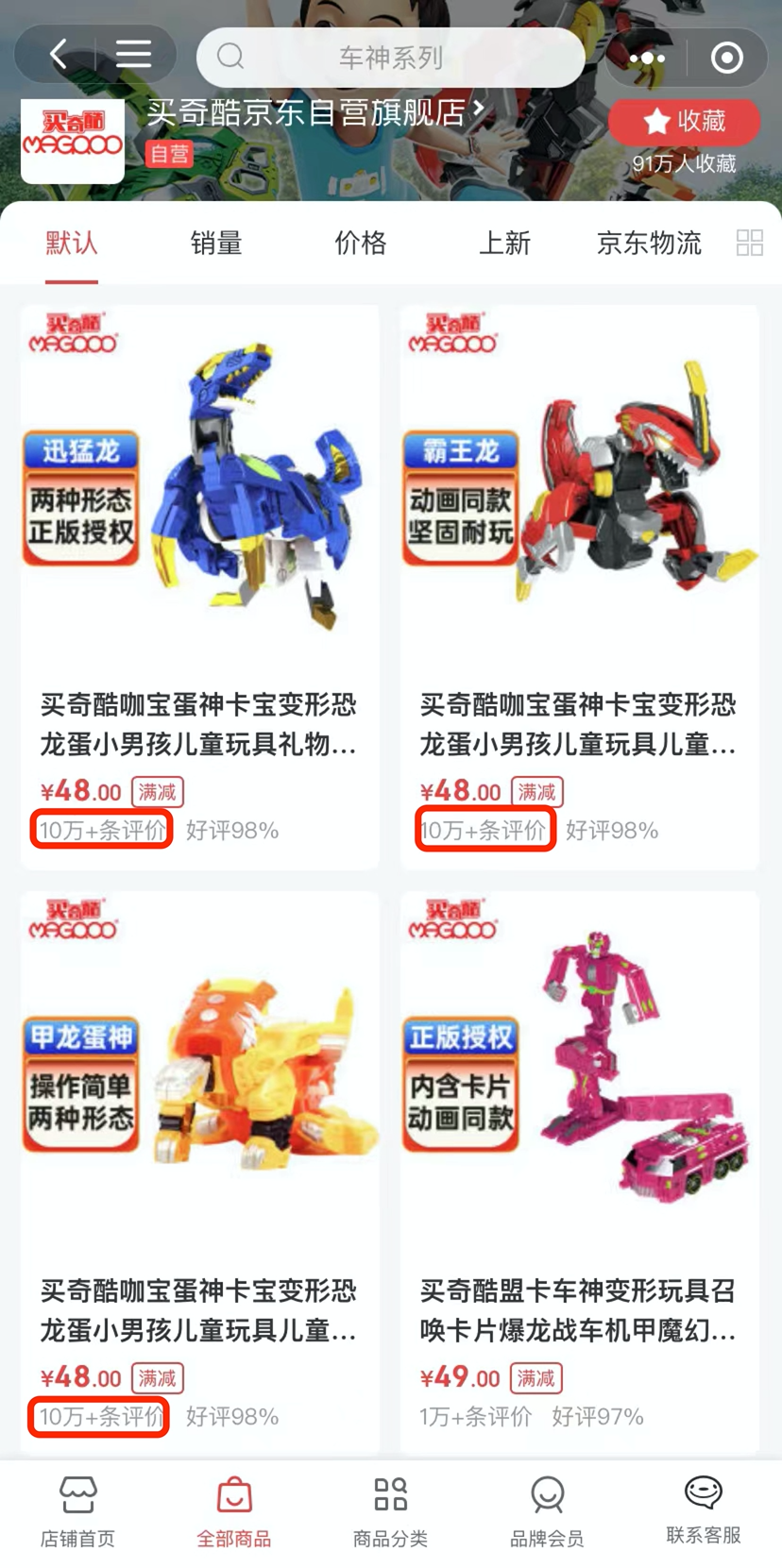 在名为“买奇酷京东自营旗舰店”的店铺,有多款咖宝系列产品的评价数过万,还有部分产品的评价数在10万级别,售价几十到几百元不等,目前店铺粉丝数为91万。