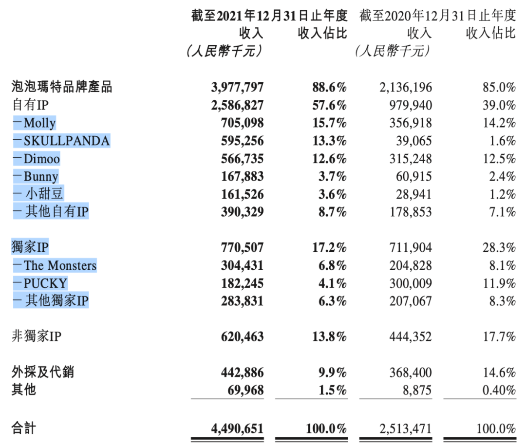 具体为2021年“Molly”实现收入人民币7.05亿元,同比增长97.6%,占比15.7%;Dimoo和SKULLPANDA在2021年分别实现收入人民币5.67亿元和人民币5.95亿元,同比分别增长了79.8%和1423.8%,占比紧随Molly其后,分别为12.6%和13.32%,SKULLPANDA超过了Dimoo。