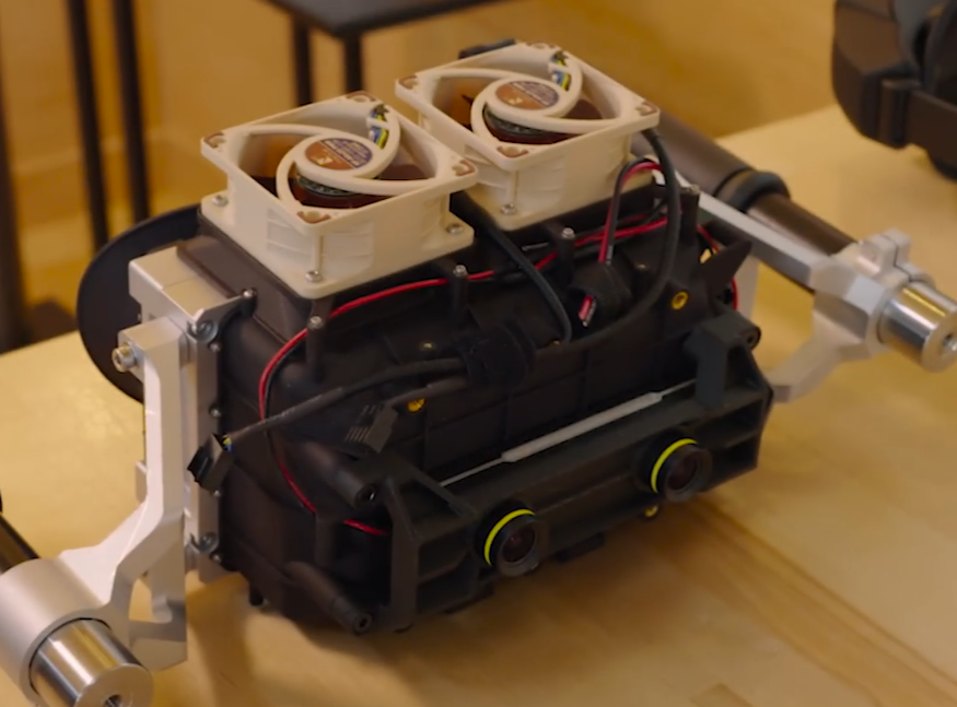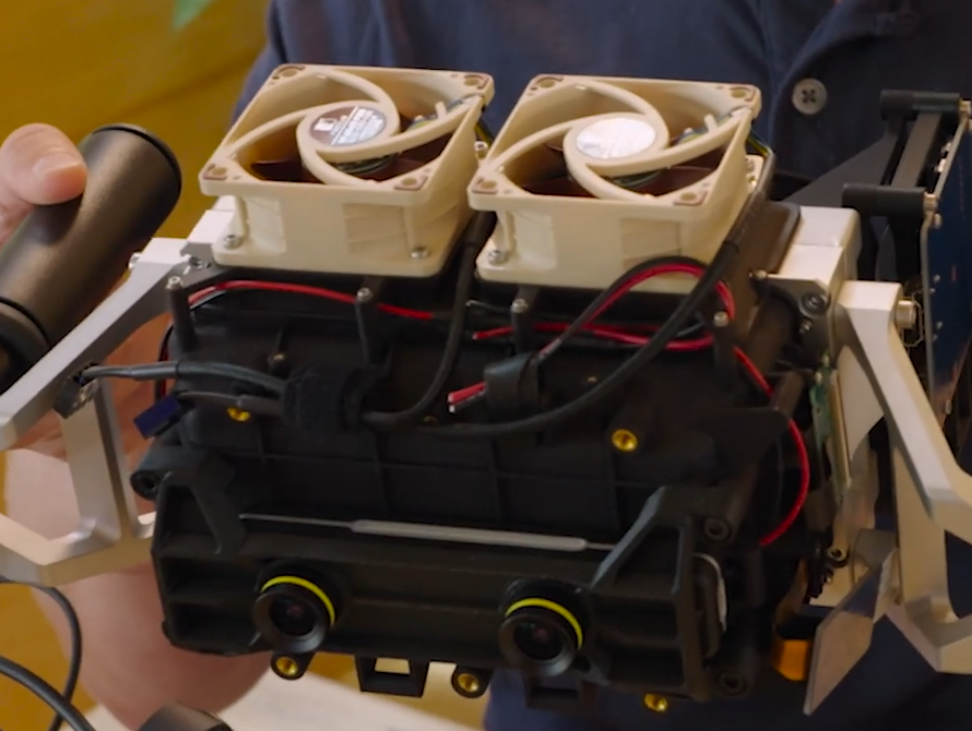 由于整个系统功率过高,团队成员甚至直接安装了两枚裸露在外的散热风扇,来给硬件设备散热;甚至因为系统过重,根本没法用常规方法戴在头上,所以只能用两个把手扶着……
