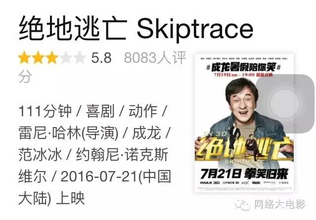 其实在近期上映的片子当中,《绝地逃亡》的确是一部全家欢影片,作为一部普通影片,其实是可以接受的。只不过它是成龙的作品。