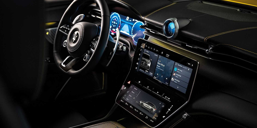 12.3英寸的全液晶仪表盘,加上12.3英寸的中央多媒体触摸屏,以及一个8.8英寸舒适控制触摸屏,玛莎拉蒂的这套“三屏内饰”所塑造的科技感与奥迪的虚拟座舱有几分异曲同工之妙,但在豪华质感方面显得更为突出,而坐落于中控屏上方的智能钟表,则更进一步增强了新车的设计感。