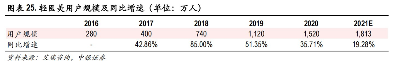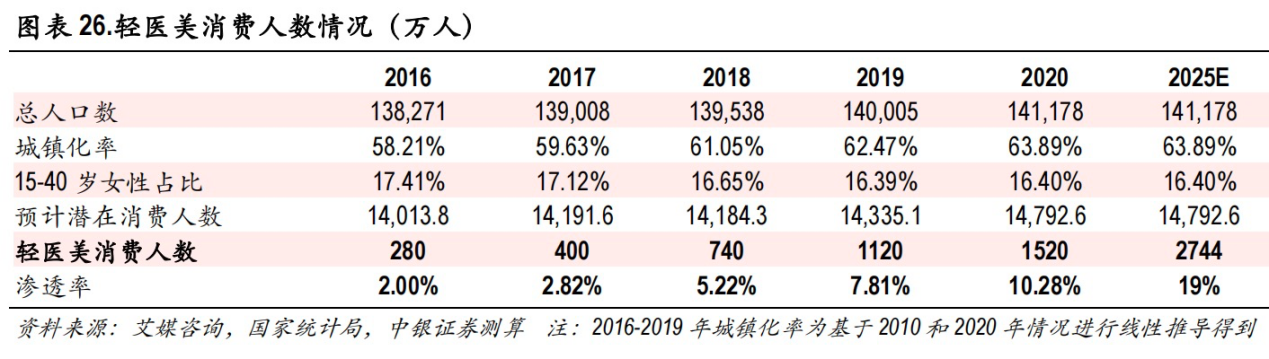基于 2016-2020 年渗透率 2pct的增速,假设 2020-2025 年渗透率以 1.6pct 速度提升)、核心潜在轻医美消费人数保持 2020 年不变,则对应 2025 年用户规模有望实现 2744 万人,为 2020 年人数规模的约 1.8 倍。