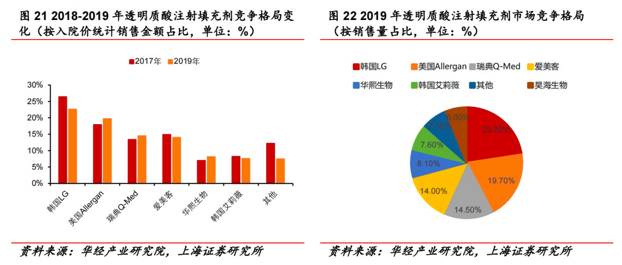 2019 年,本土前 3 大透明质酸填充剂企业按销量统计分别为爱美客、华熙生物、昊海生科,爱美客以 14%市占率位居全体第四、国货第一,华熙生物市占率也升至 8.1%。