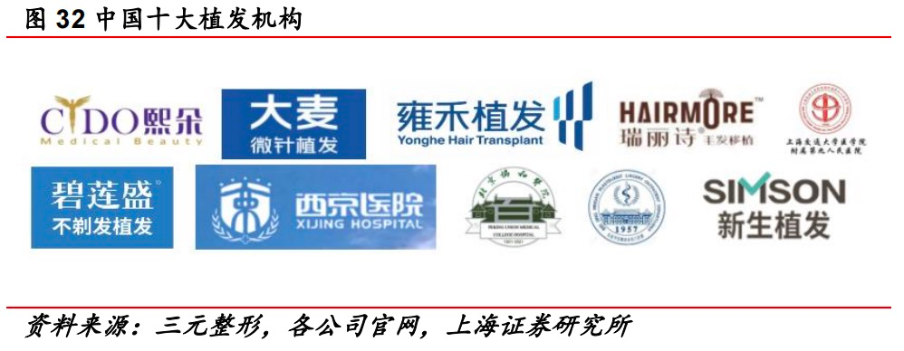 植发行业公立医院占比低,主要为连锁民营植发机构、微整形医院等构成,如雍禾医疗、大麦植发等。
