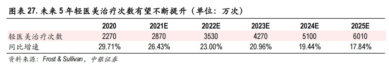 据 Frost & Sullivan 预测,2025 年轻医美消费总次数有望达到 6010 万次,为 2020 年的 2.65 倍。