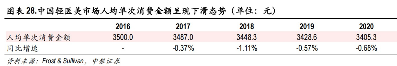 据 Frost & Sullivan 披露数据,由终端轻医美市场终端总消费金额和总诊疗次数可计算得到 2016-2020 年国内轻医美市场人均单次消费金额呈小幅下降趋势。