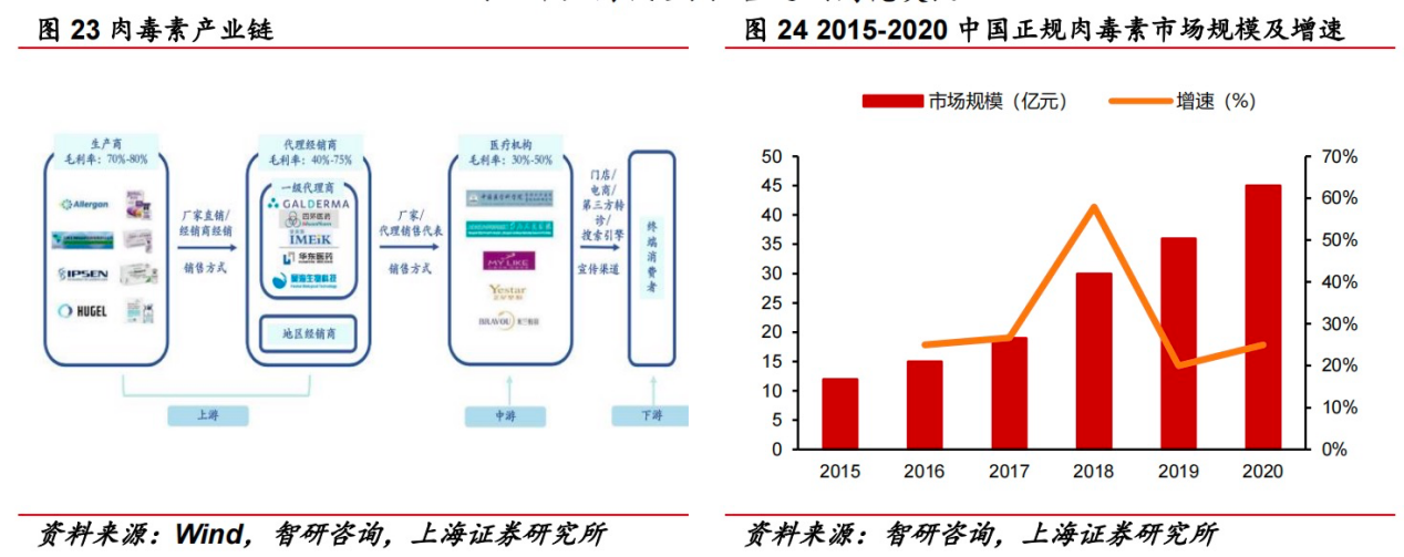 据智研咨询数据整理,2020 年国内肉毒素市场规模约为 45 亿元,2016-2020 年 CAGR 达 27%。2022 年市场规模或将超过 60 亿元,2025年甚至预计达到135亿元。