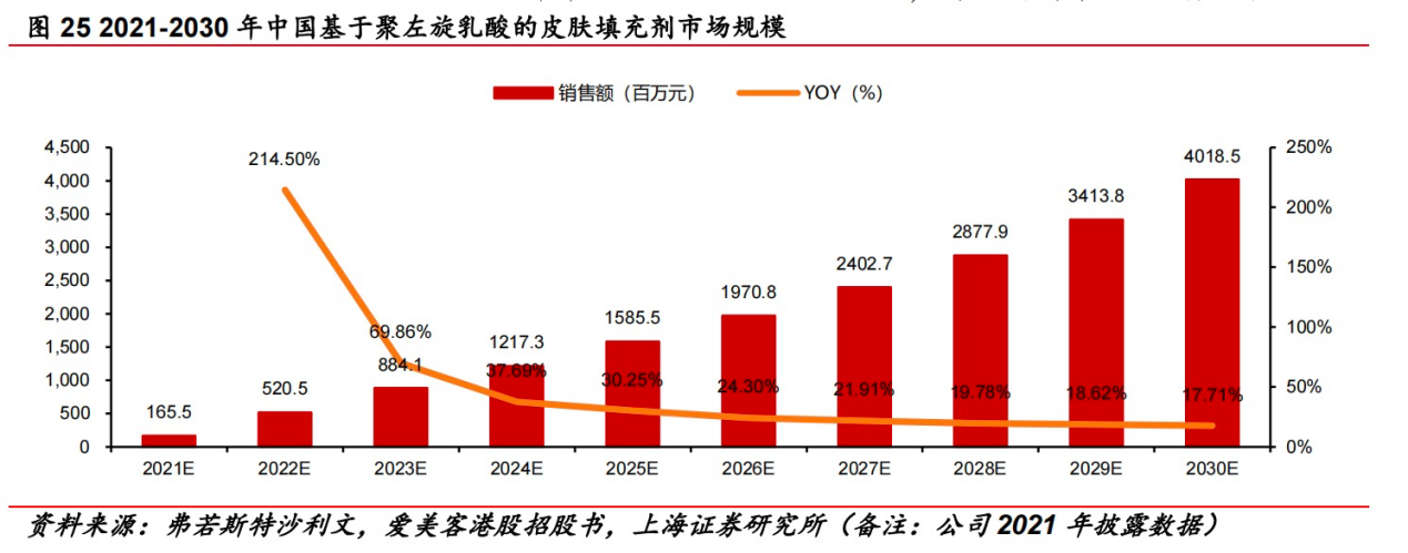 据弗若斯特沙利文预测,2022 年中国基于聚左旋乳酸的皮肤填充剂市场规模可达 5.21亿元,同比+214.50%。