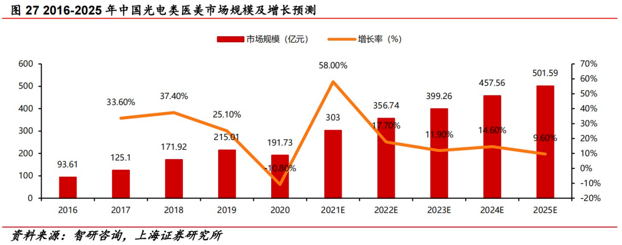 2020 年国内能量源医美项目终端市场规模达191.73 亿元,2016-2020 年 CAGR 达 23%,未来 5 年我们预计该细分赛道仍将保持在 20%以上的年均复合增速。