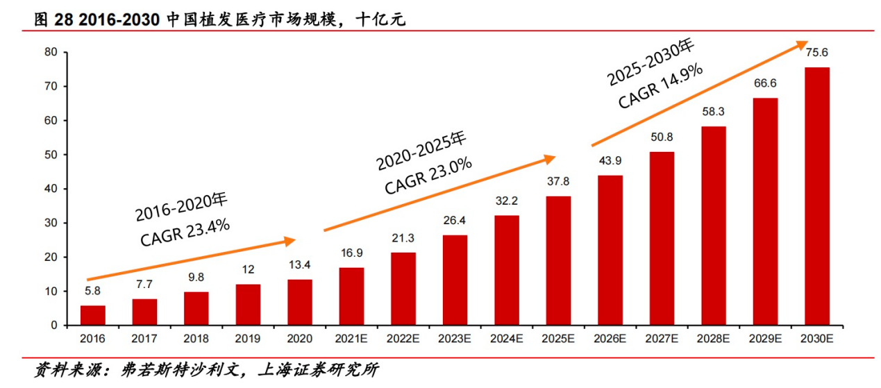 根据沙利文数据,2020 年中国医疗养固服务市场规模达 50 亿元,预计 2030 年市场规模有望达 625 亿元,2020-2030 年复合增速达28.7%,增速高于植发市场的增速,有望成为毛发医疗行业又一成长曲线。
