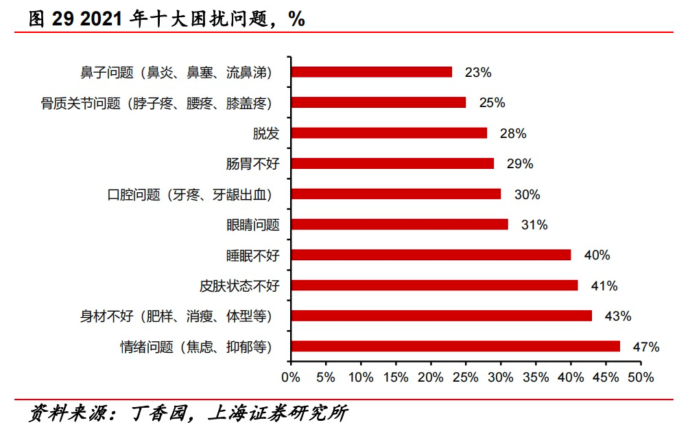 据丁香园《2022 国民健康洞察报告》显示,脱发已成为人们健康困扰第八位,与上年相比排名前推。