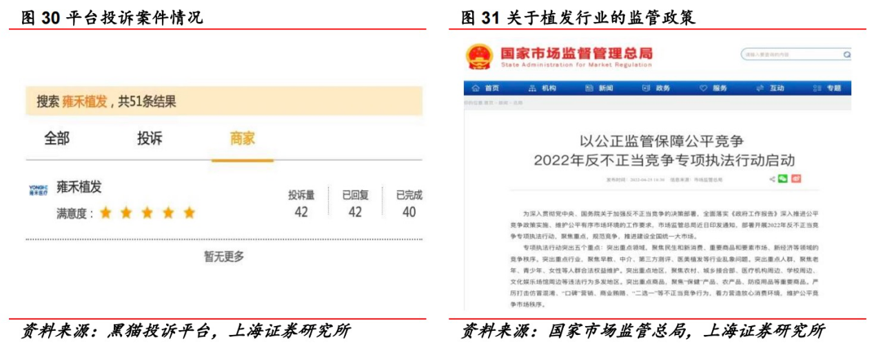 植发服务与养固服务呈互补关系,未来有望实协同增长。近年随着植发业务的加速扩展,投诉事件增加。