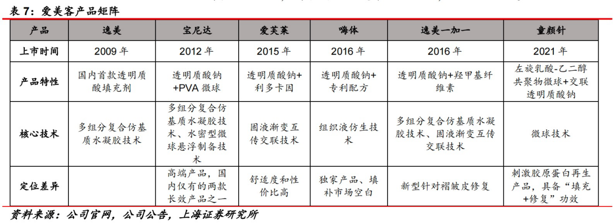 目前拥有 7 款获得三类医疗器械认证的产品,包括 5 款基于透明质酸的皮肤填充剂、1 款童颜针和 1 款PPDO面部埋植线产品。产品组合丰富且具有梯队性,嗨体占据细分市场,先发优势明显。
