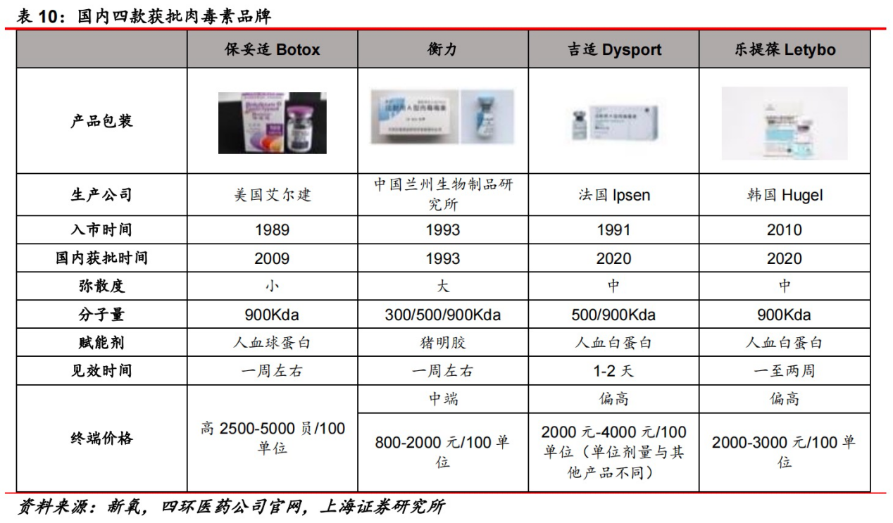 肉毒素技术壁垒高,审核周期长,国内竞争者主要是衡力(兰州生物)、保妥适(艾尔建)、乐提葆(四环医药代理)、吉适(高德美)。