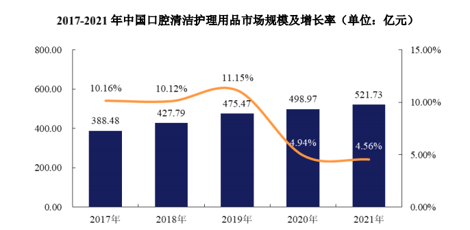2017年到2021年,我国口腔清洁护理用品行业市场规模从388亿增长至522亿,年复合增长率7.65%,但2020年和2021年,行业增速分别只有4.94%和4.56%。
