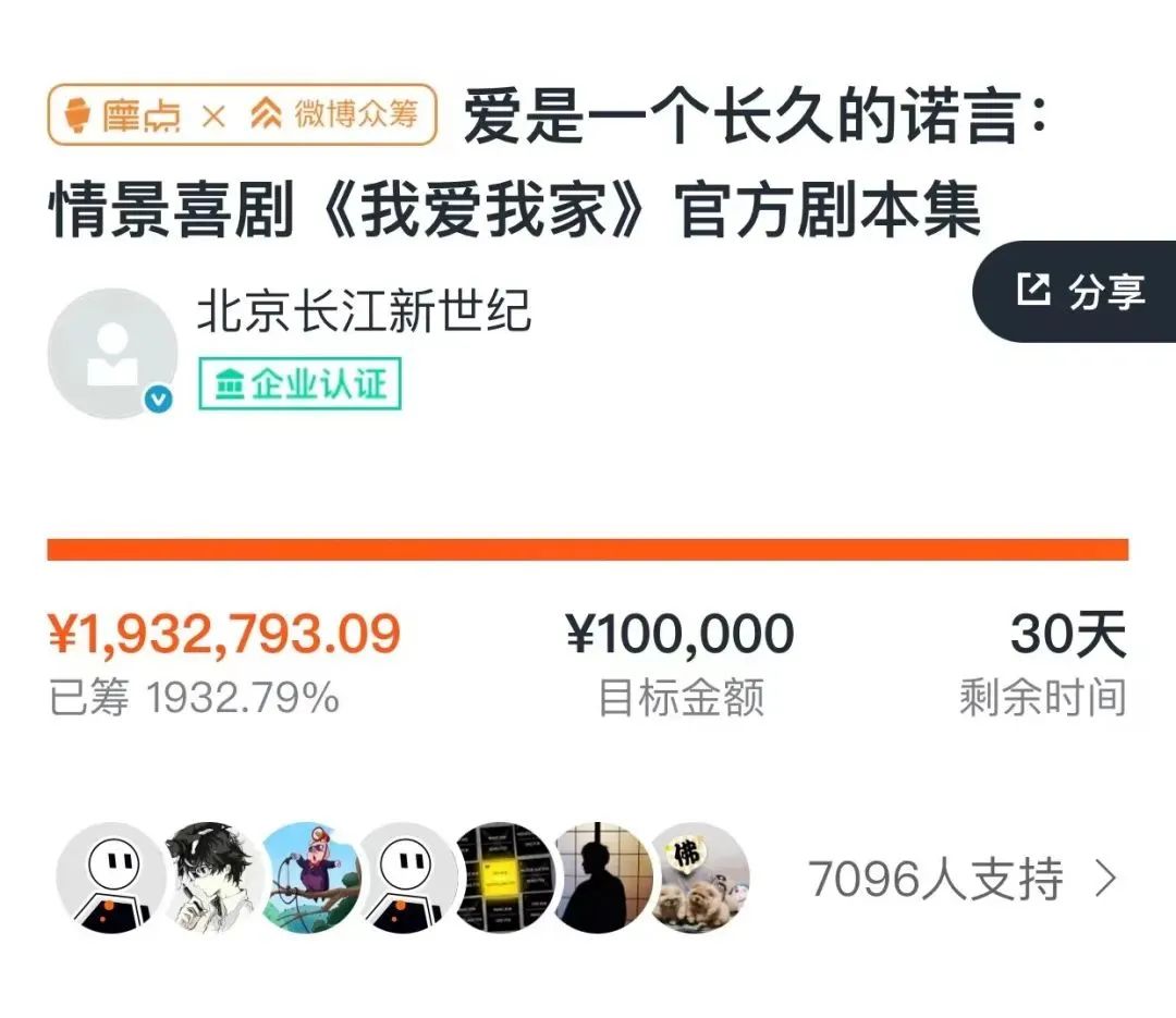 今年三月,《我爱我家》推出了官方剧本集,并在摩点网开启众筹,目标金额为10万元。原定众筹时间为45天,但完成目标最后只用了一分钟。最终该项目筹集金额达数百万。