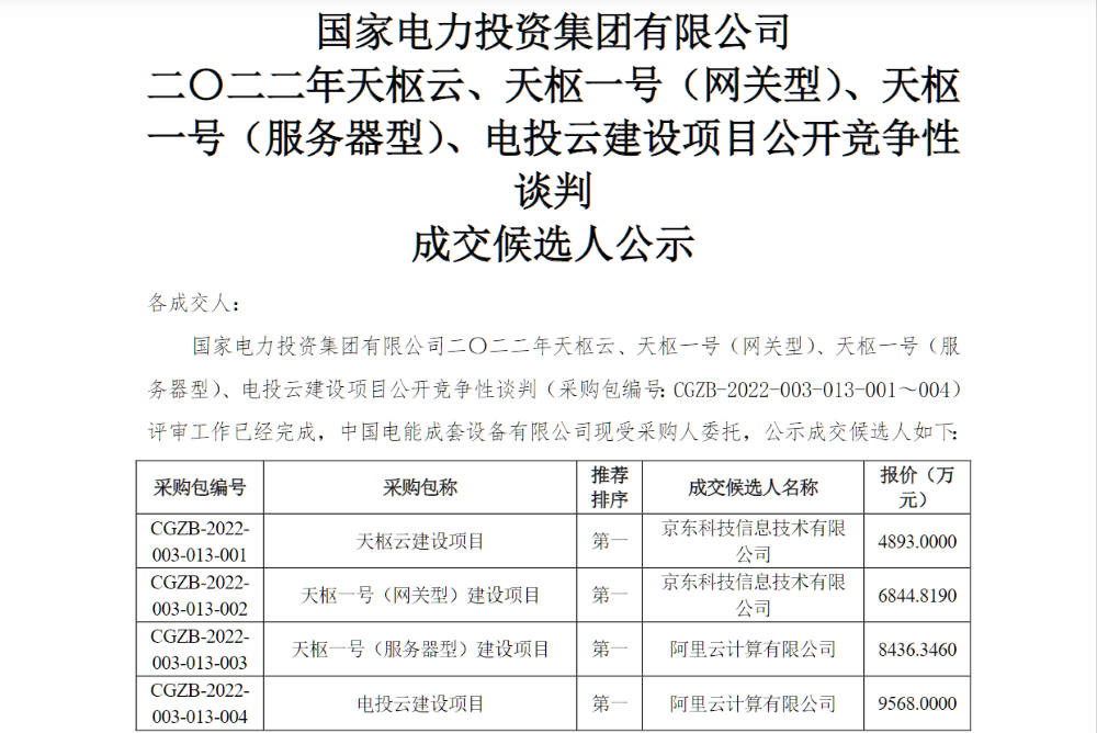 智东西6月22日消息,本周一,国家电力投资集团有限公司2022年天枢云、天枢一号(网关型)、天枢一号(服务器型)、电投云建设项目发布公开竞争性谈判成交结果公告。阿里云中标天枢一号(服务器型)建设项目和电投云建设项目,中标总金额为1.8亿元。京东中标天枢云建设项目和天枢一号(网关型)建设项目,中标总金额为1.17亿元。