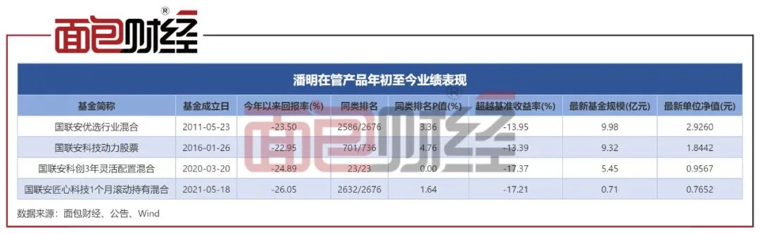 截至2022年6月21日,潘明在管产品出现较大回撤,年内回报率均低于-22%(初始基金口径),跑输业绩基准逾10个百分点,在同类排名中处于尾部。