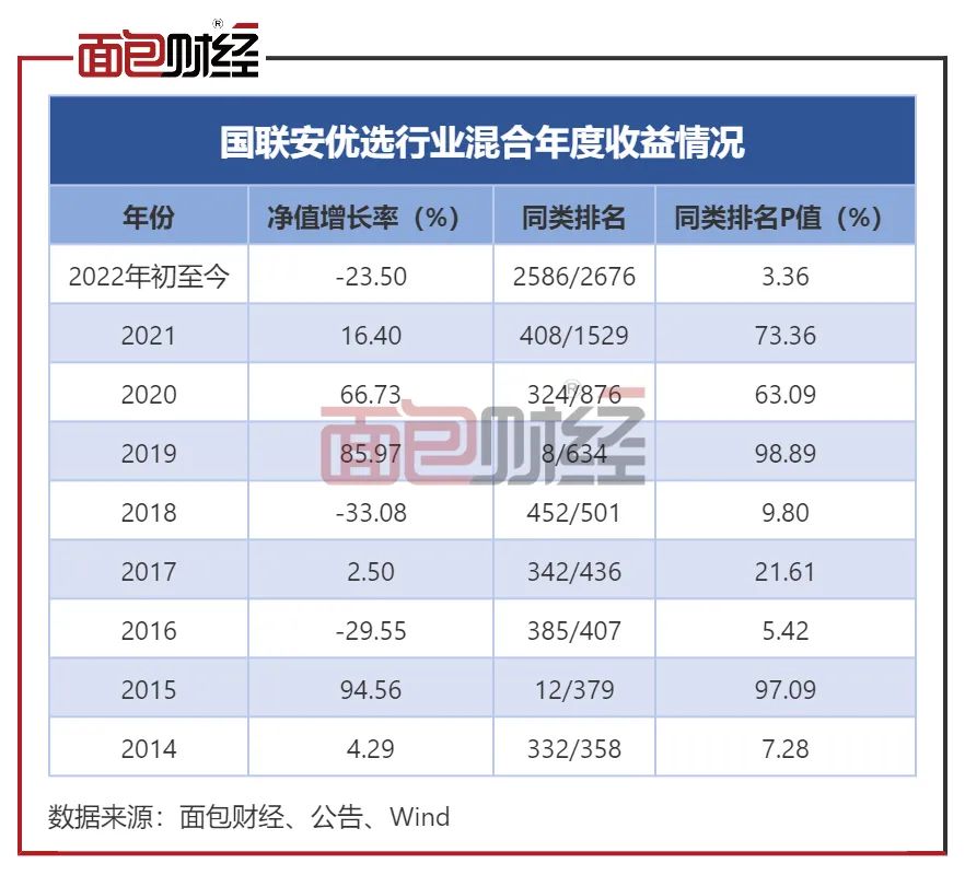 国联安优选行业混合在2015年、2019年的净值增长率超过80%,跑赢90%以上的同类基金;2016年、2018年出现负收益,同类基金中业绩排在最后10%。2022年,该基金的业绩再度大幅下滑,年初至今单位净值回撤23.5%,在2600余只偏股混合型基金中排名靠后。