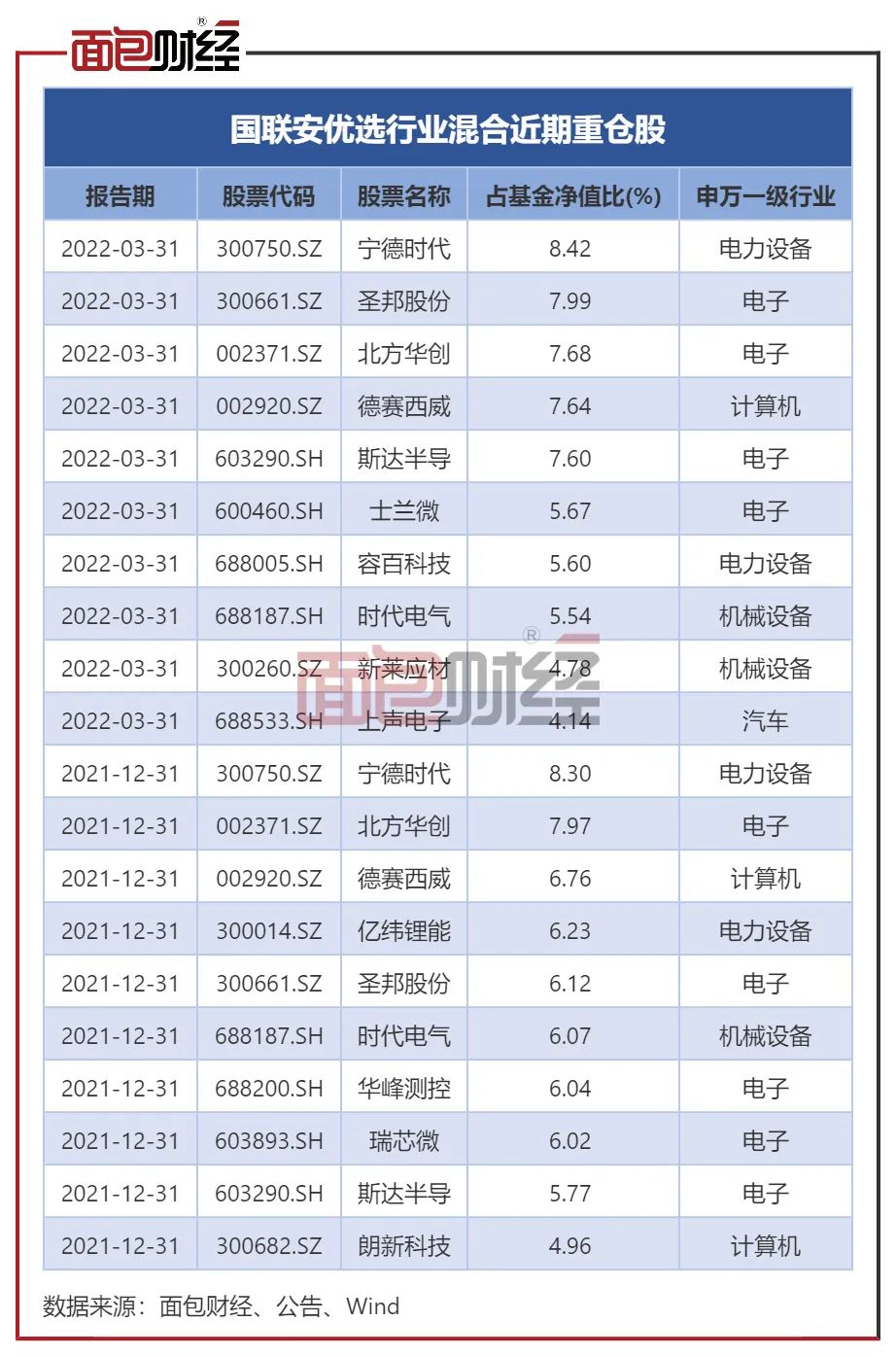 近2个季度,该基金的重仓股以宁德时代、圣邦股份等电子、电力设备行业股票为主,潘明也在基金定期报告中将基金业绩直接与中信TMT指数进行比较。