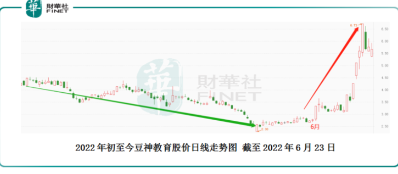 截至6月23日,6月初至今豆神教育股价累计涨幅为69%,该涨幅位居A股教育板块前列。