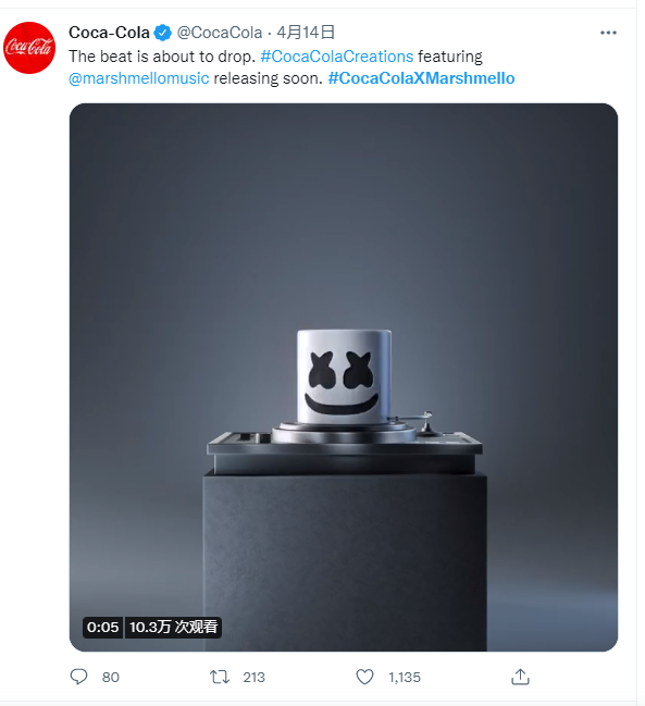 今年4月14日,可口可乐在推特发文称“The beat is about to drop”(节拍即将落下)。同时品牌还表示其全球创意平台“乐创无界”和音乐人Marshmello的合作即将发布。