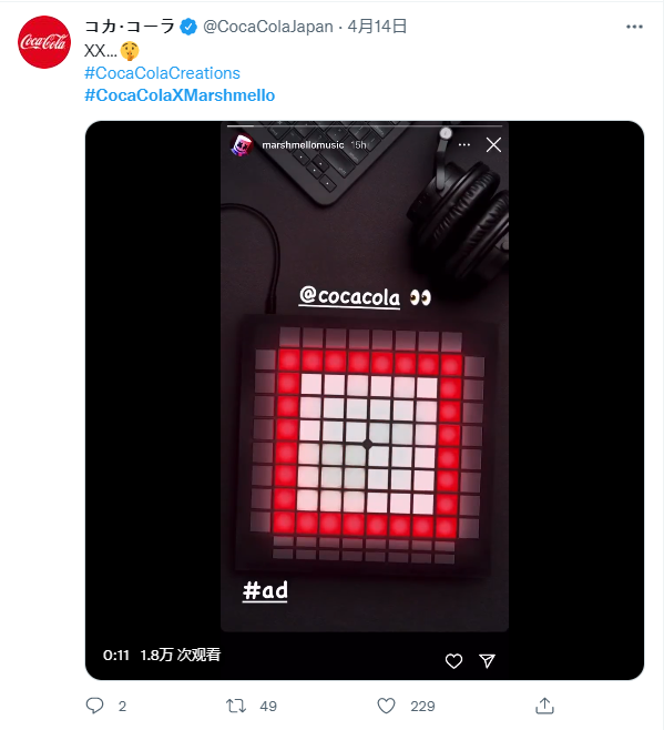 在可口可乐官宣合作消息的同日,Marshmello也在自己的Instagram发布动态@了可口可乐,并配上一张演奏电子乐用的launchpad照片,证实了这一合作。此后,可口可乐日本官方推特还转发了该条Instagram动态,似乎在暗示产品将在日本发布。