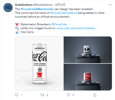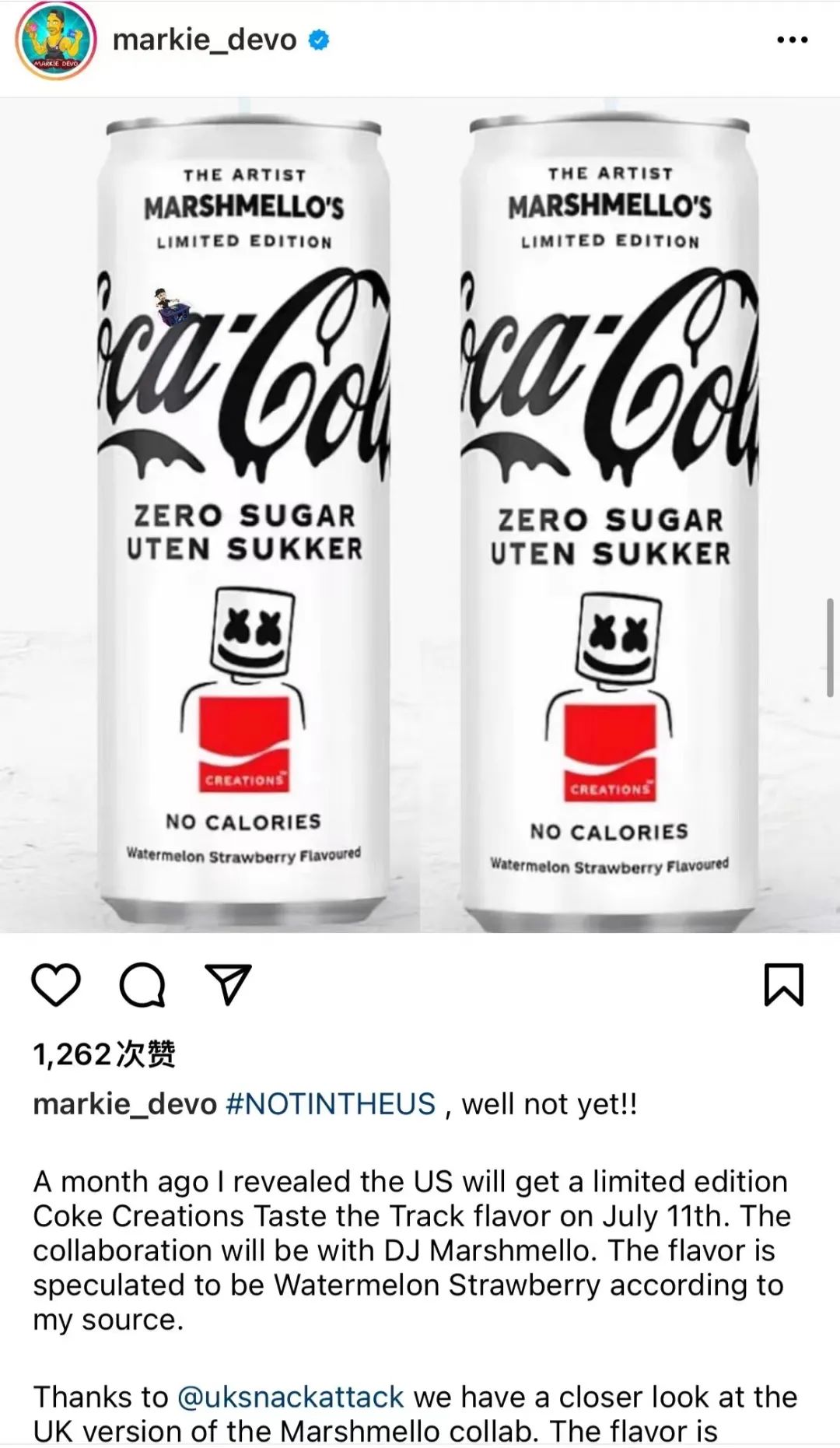 博主Markie Devo表示,他曾在1个月前透露过可口可乐将于7月11日在美国发售和Marshmello的合作限定版可乐,并也引用了UK Snack Attack发布的图片,侧面证实其真实性。