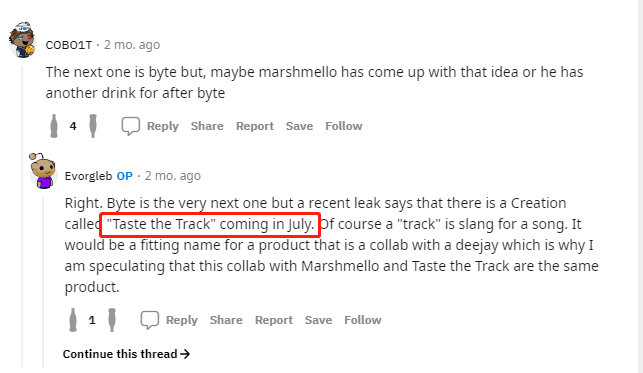 其实早在4月,就有网友在Reddit上在讨论称“乐创无界”创意平台将先发布“律动方块”,再之后的新品可能是和Marshmello的联名新品。并有人回复称这个发售顺序是正确的,且联名新品名字是“Taste the Track”。