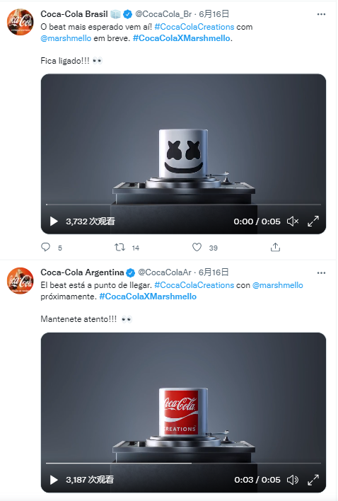 我们也在持续关注品牌的动态,直到近期发现,6月16日可口可乐的巴西、阿根廷官方推特账号突然又转起了4月份发布的Marshmello合作相关视频。